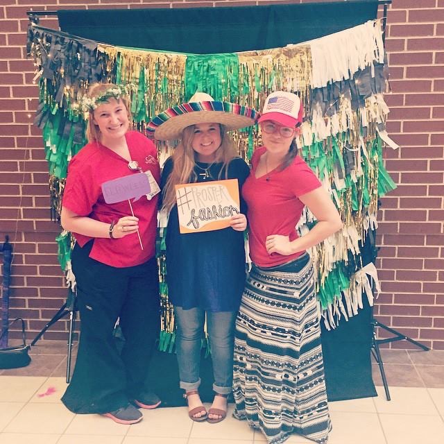 I brought all of my old sorority date party hats and accessories to have as props! I also found a chalkboard sign and inflatable food items from Target for $1! Not only was this an easy and affordable way of showcasing my class, it was also tons of fun to see people from the community get to dress up and be goofy! A great fun and trendy way to stay on budget for any event!