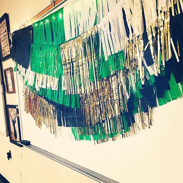 Continue to piece together your strands of fringe, try to make every one a different combination so that you end up with an intricate look! Once you have finished each strand string them to the stand for your photo booth. I found that the more I layered the pieces the better the back drop looked!